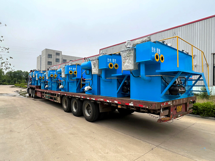溶气气浮机采用新型高效的溶气设备——微气泡发生器,代替传统的引气设备向水中溶气,并在气浮区域内安装若干斜管组,包括箱体、刮渣机、螺旋出料机共同组成一个完整气浮净水装置。理论上讲,气浮的处理效果与停留时间是没有直接联系的,而只与气浮面积有关,如果将水深H的气浮区减少为水深H/10,那么气浮距离和停留时间都将缩小10倍,这就是著名的“浅池理论”。气浮区加入斜管的目的是增大气浮面积,大大降低了雷诺系数,使气浮避免在紊流状态下进行,制造良好的层流状态,达到浅层气浮的效果。